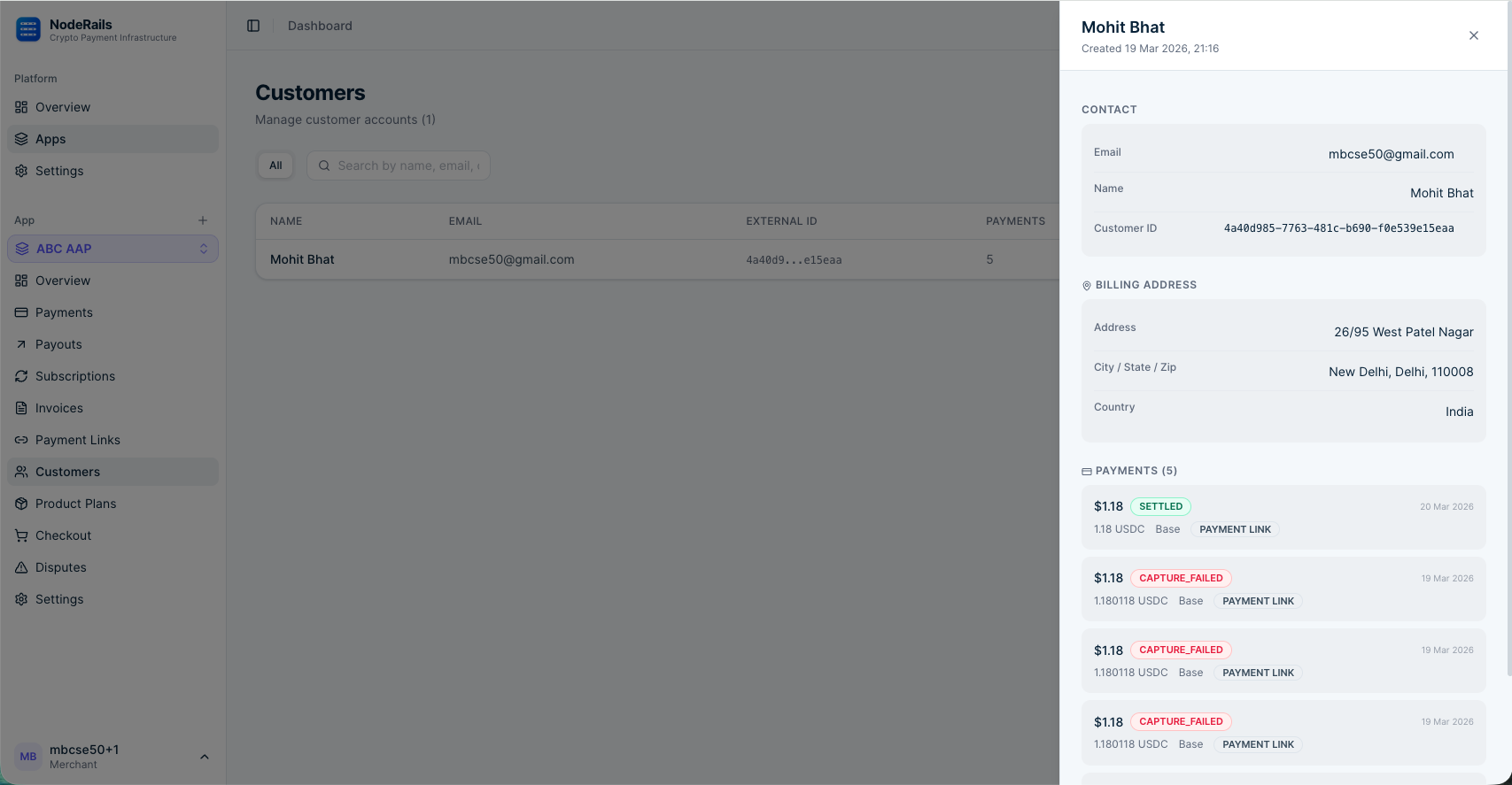 Track payments by chain, token, and status. See revenue breakdown and customer activity instantly.
